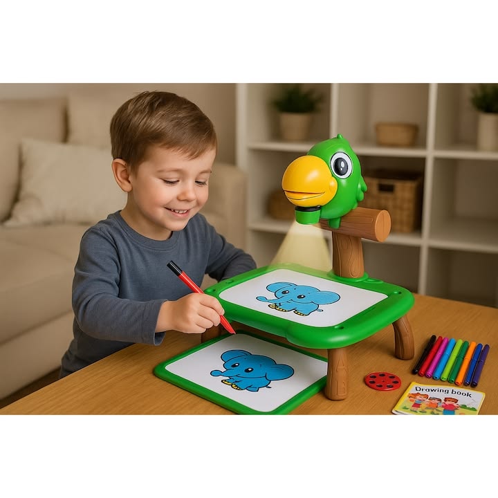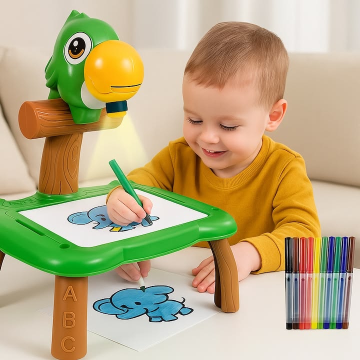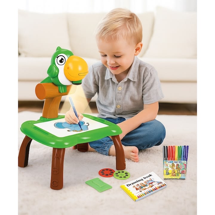 Masa de desen cu proiector este o jucărie educativă care îmbină distracția cu dezvoltarea creativității copiilor. Proiectează imagini colorate pe tablă, pe care cei mici le pot reproduce cu cariocile incluse. Perfectă pentru joacă individuală sau activități în familie.